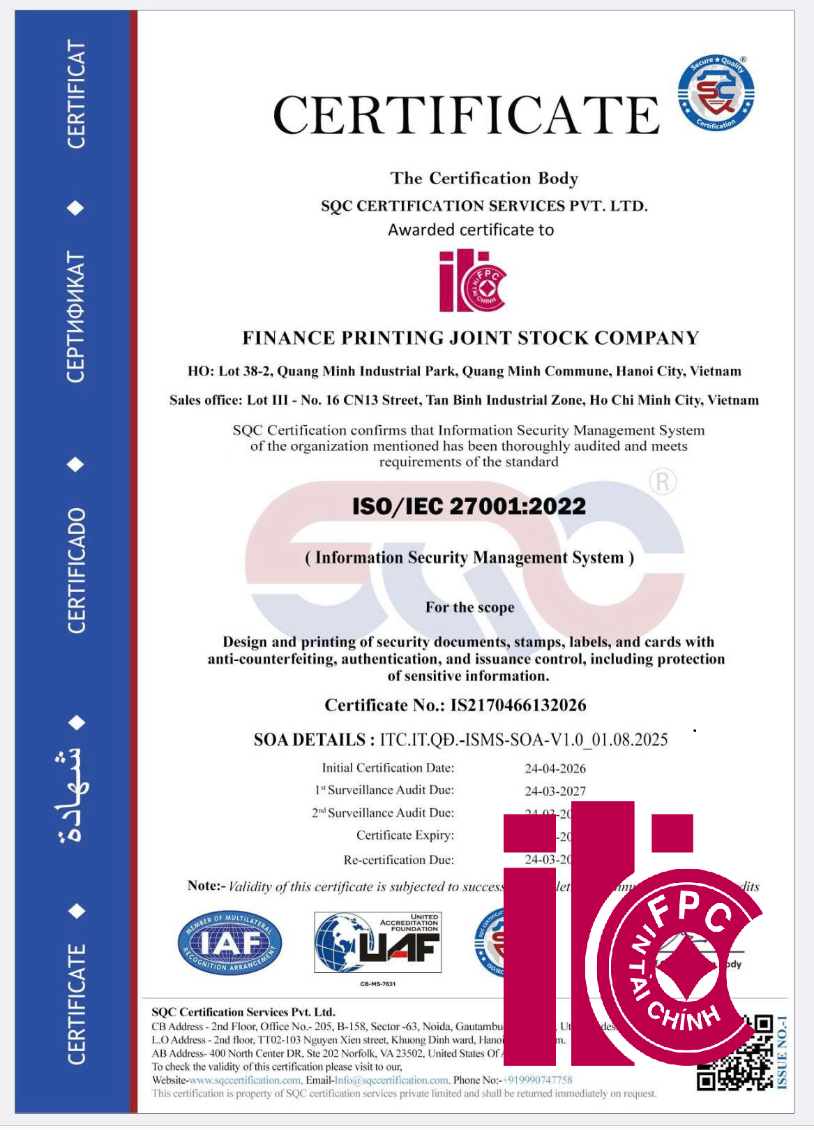 Chứng chỉ được cấp bởi tổ chức SQC Certification Services Pvt. Ltd và được công nhận bởi IAF, khẳng định năng lực của In Tài chính trong việc bảo vệ các tài sản thông tin trọng yếu của khách hàng.